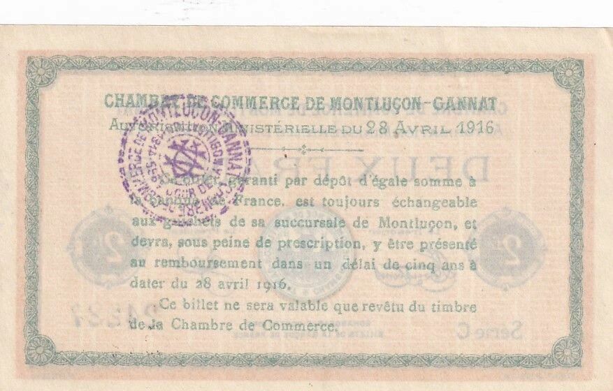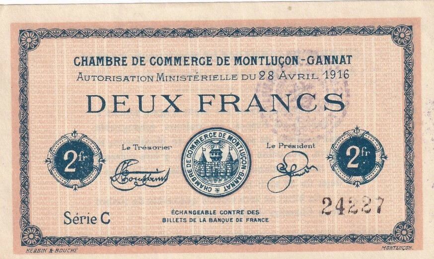 Ce billet de 2 francs a été émis par la Chambre de Commerce de Montluçon-Gannat, avec l'autorisation ministérielle datée du 28 avril 1916. Il s'agit d'un billet de nécessité émis en période de pénurie monétaire durant la Première Guerre mondiale.