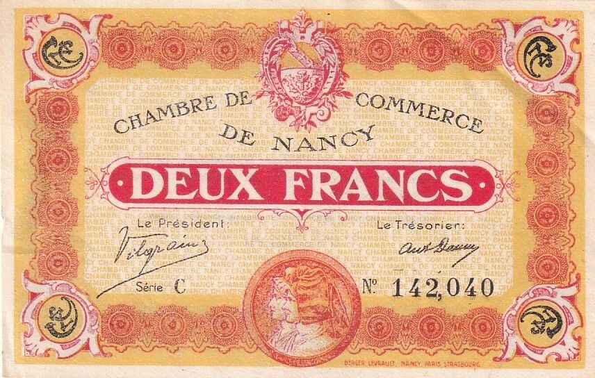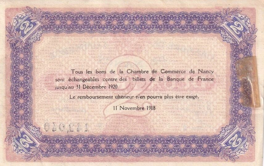 Ce billet de deux francs a été émis par la Chambre de Commerce de Nancy. Il porte la date du 11 novembre 1918, jour de l'Armistice de la Première Guerre mondiale.