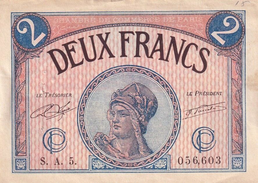 Sur le recto du billet, on peut lire l'inscription "CHAMBRE DE COMMERCE DE PARIS" en lettres capitales, indiquant l'institution émettrice. La valeur nominale, "DEUX FRANCS", est également mentionnée. Les signatures du Trésorier et du Président de la Chambre de Commerce sont présentes, authentifiant le billet. La série "S. A5" et le numéro de série "056.603" sont imprimés pour identifier ce billet spécifique.