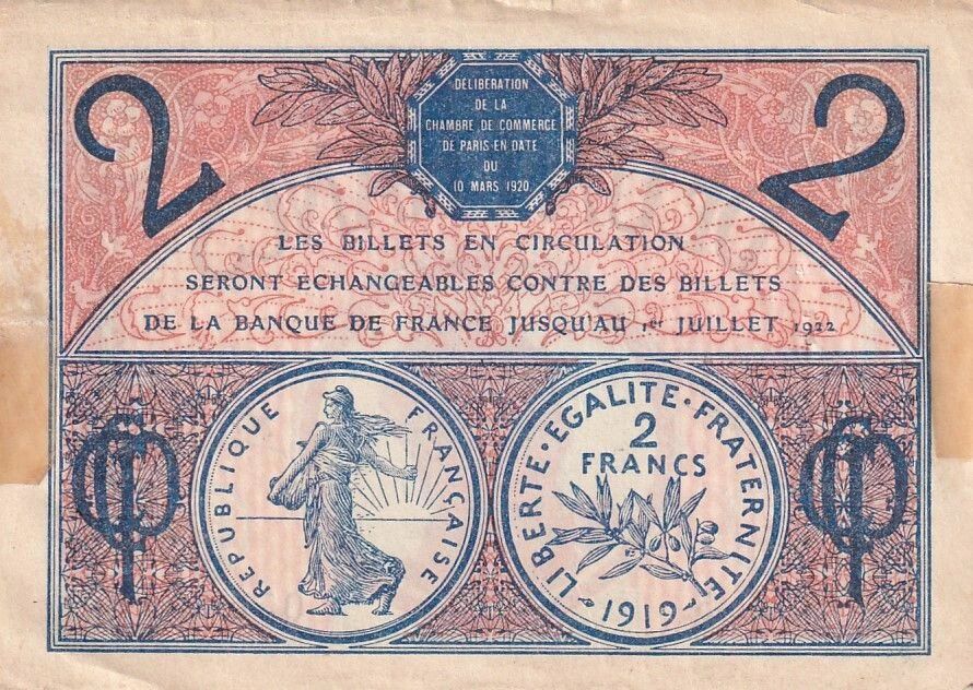 Le verso du billet porte une inscription précisant les conditions d'échange. Il est indiqué que le billet a été émis suite à une délibération de la Chambre de Commerce de Paris en date du 10 mars 1920. De plus, il est stipulé que ces billets en circulation étaient échangeables contre des billets de la Banque de France jusqu'au 1er juillet 1922. Cette information est cruciale car elle donne une limite de temps pour l'utilisation de ce billet comme moyen de paiement.