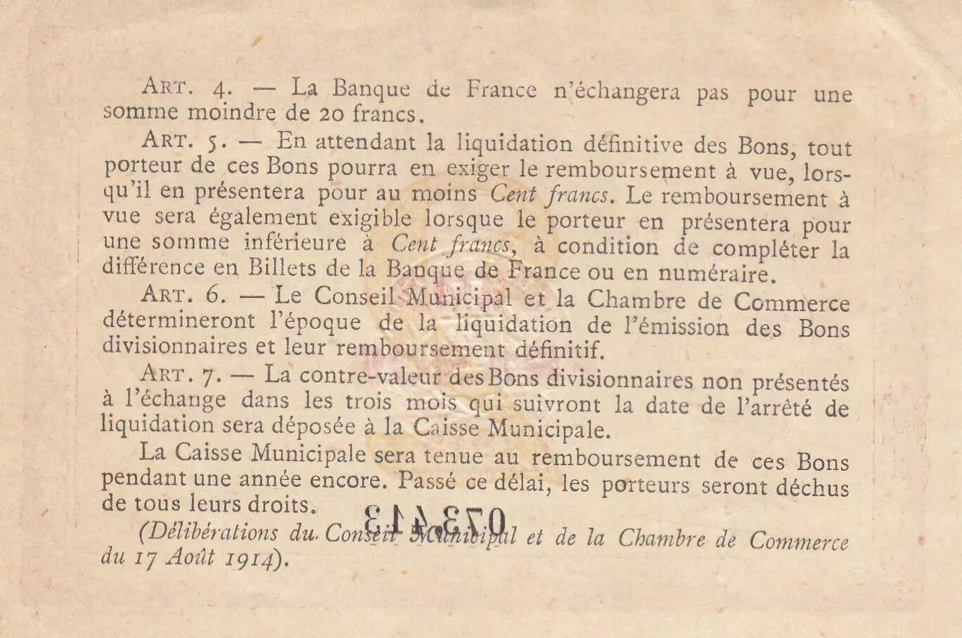 Les billets de nécessité comme celui-ci étaient souvent émis par des institutions locales telles que les chambres de commerce, les municipalités ou les entreprises privées pour pallier le manque de monnaieDivision monétaire d'un pays. circulante pendant les périodes de crise. Ils témoignent des conditions économiques et sociales de l'époque et offrent un aperçu précieux de l'histoire locale et régionale.