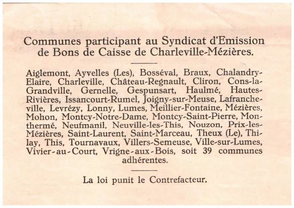 Home > French Banknotes > Necessity Money (1789-1945) > City and Municipal Bonds 1914-1925 > France 2 Francs Charleville-Mézières Cities - Charleville-Mézières - 1916