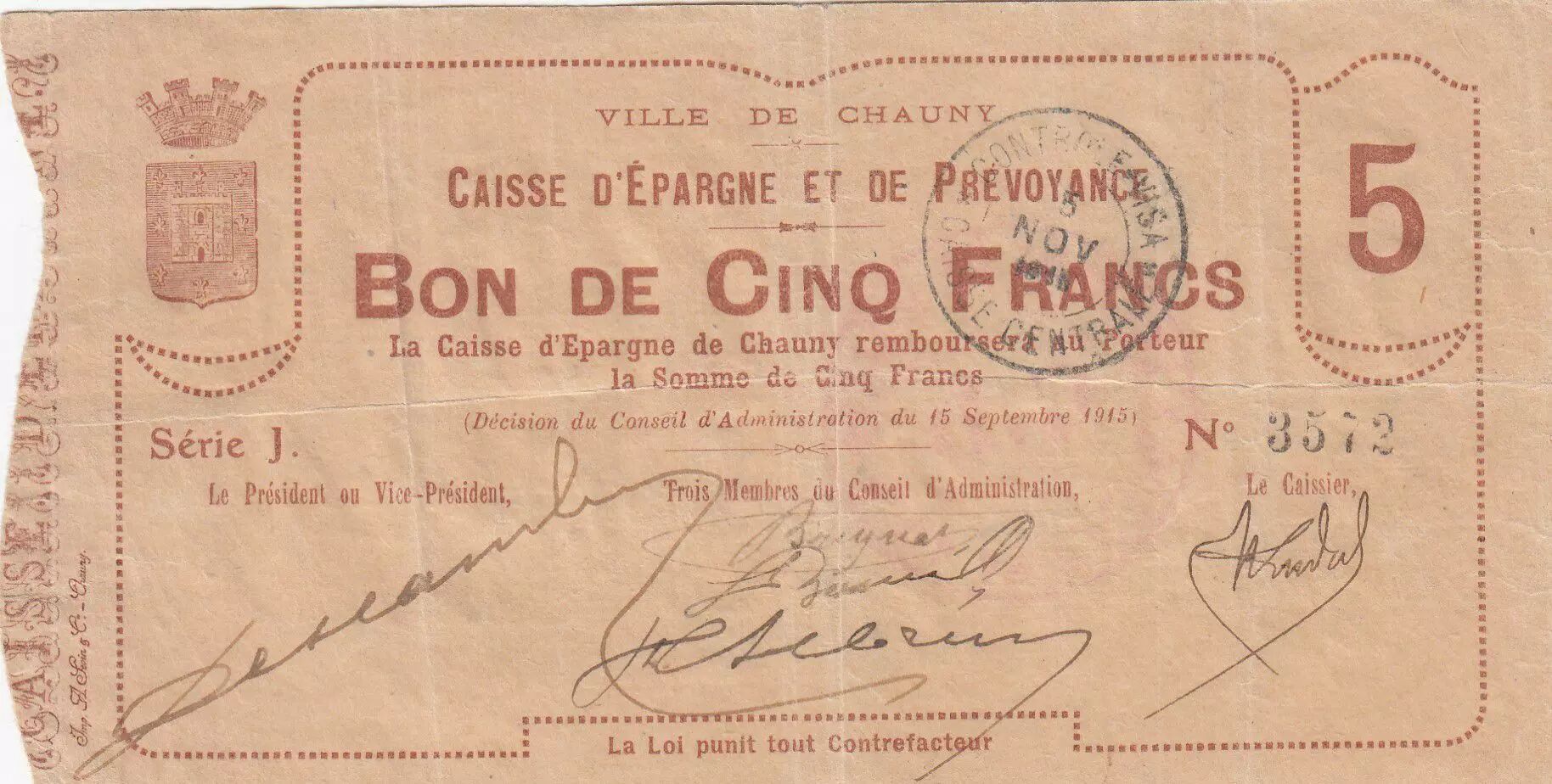 Home > > France 2 Francs Chauny City - 15-09-1915 Serial J - VF