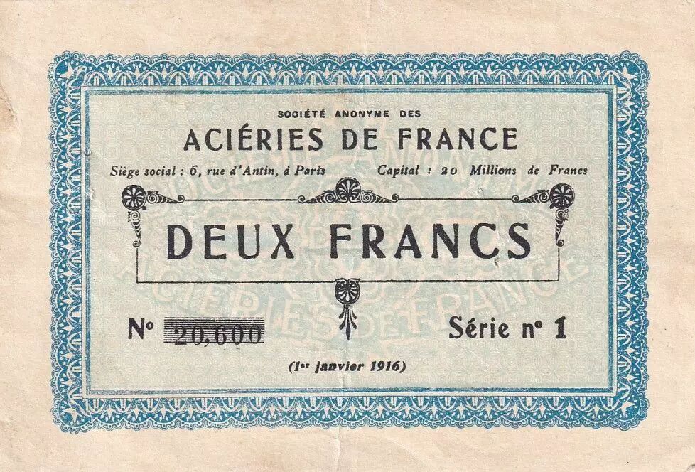 Le billet a une valeur nominale de deux francs. Il a été émis dans le département du Pas-de-Calais (62), plus précisément dans la commune de Béthune. Cette émission locale témoigne des initiatives prises par les communes et les entreprises pour pallier le manque de numéraire durant le conflit.