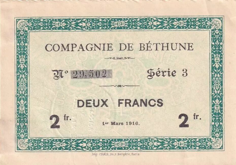 Ce billet de banque est une émission de nécessité française, d'une valeur faciale de 2 francs. Il a été émis le 1er mars 1916 par la Compagnie de Béthune. Cette émission s'inscrit dans le contexte des Nécessités Communes et Villes, une période allant de 1914 à 1918, marquée par des émissions monétaires locales en raison des difficultés économiques liées à la Première Guerre mondiale.