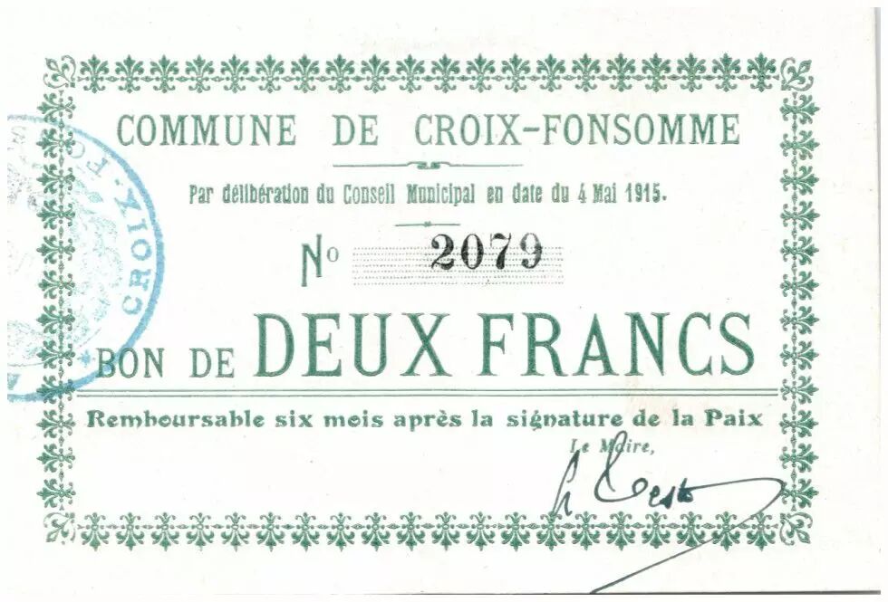 Banknote France 2 Francs Croix-Fonsomme City - 1915