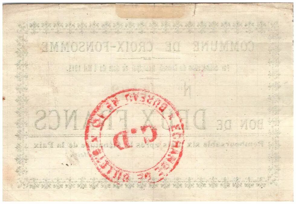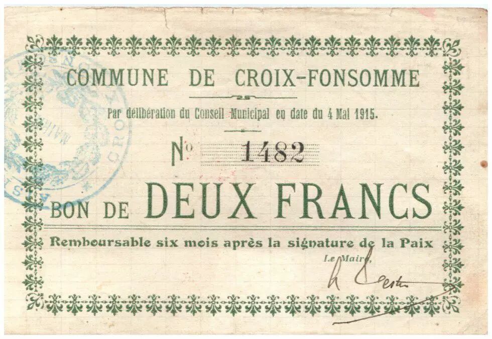 Banknote France 2 Francs Croix-Fonsomme City - 1915