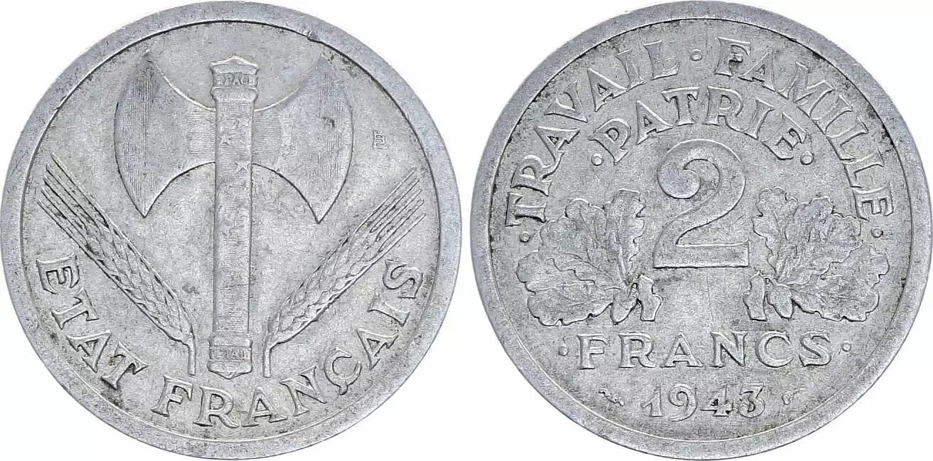The 2 Francs coin, minted under the French State in 1943, was produced in Beaumont-le-Roger. This coin commemorates a specific period in French history.