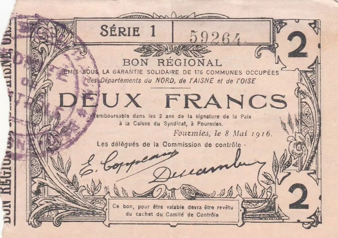 Accueil > Billets Français > Billets de Nécessités (1789-1945) > Bons de villes et de communes 1914-1925 > France 2 Francs - Fourmies - Bon Régional - 08-05-1916 - Série 1