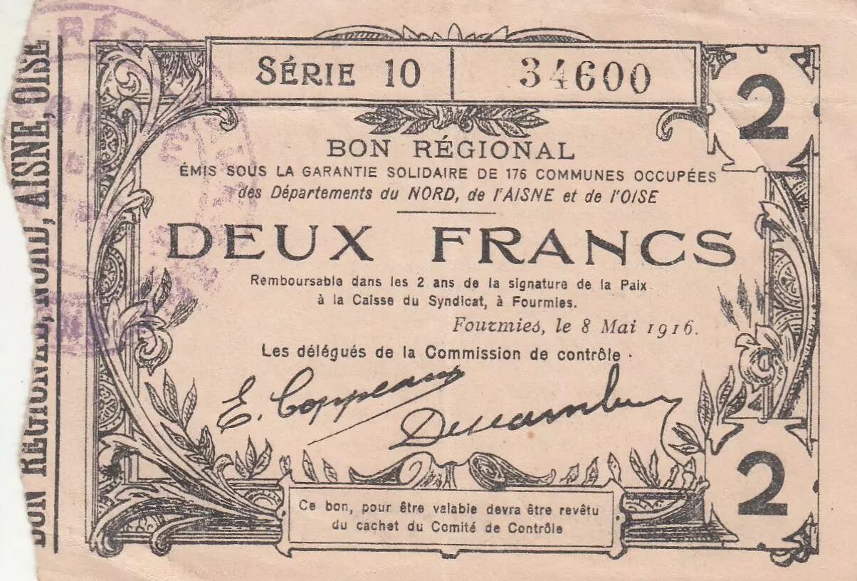 Banknote France 2 Francs - Fourmies - Regional Coupon - 08-05-1916 - Serial 10