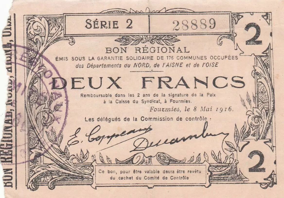 Banknote France 2 Francs - Fourmies - Regional Coupon - 08-05-1916 - Serial 2