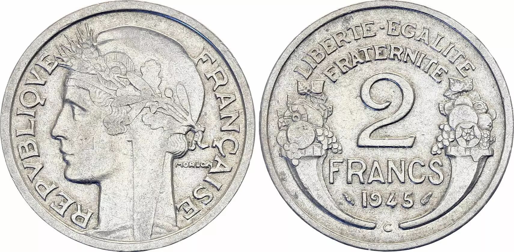 This coin is a 2 Francs coin minted in 1945 under the authority of the French State. The coin is made of aluminum, giving it lightness and malleability. Its weight is 2.25 grams.