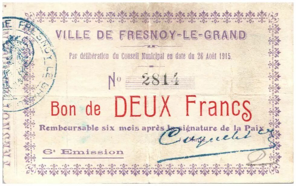 Banknote France 2 Francs Fresnoy-Le-Grand City - 1915