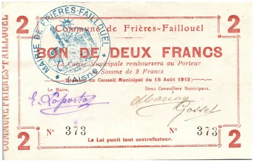 Banknote France 2 Francs Frieres-Faillouel City - 1915
