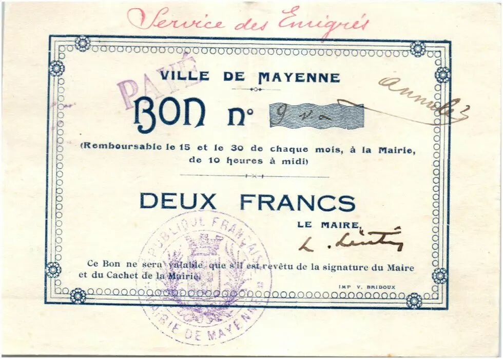 Banknote France 2 Francs Mayenne City