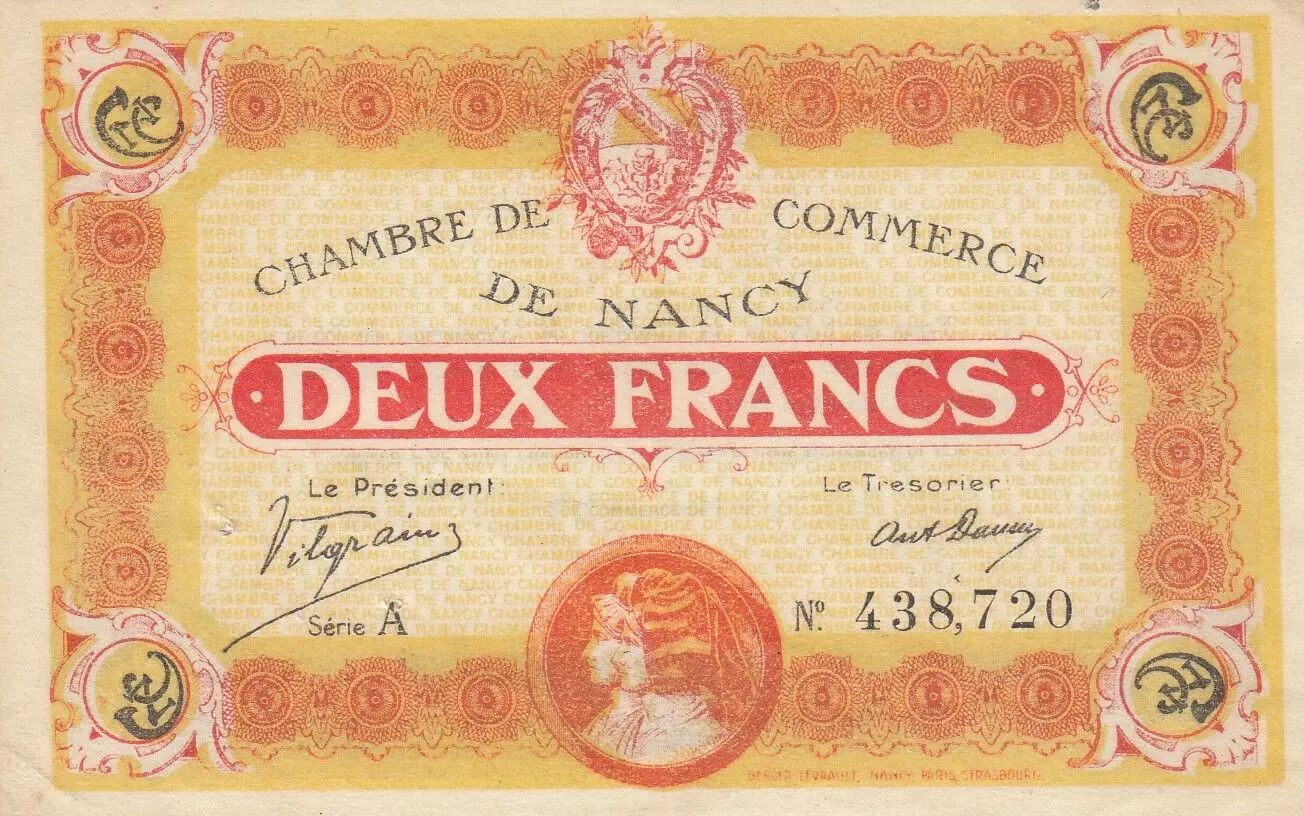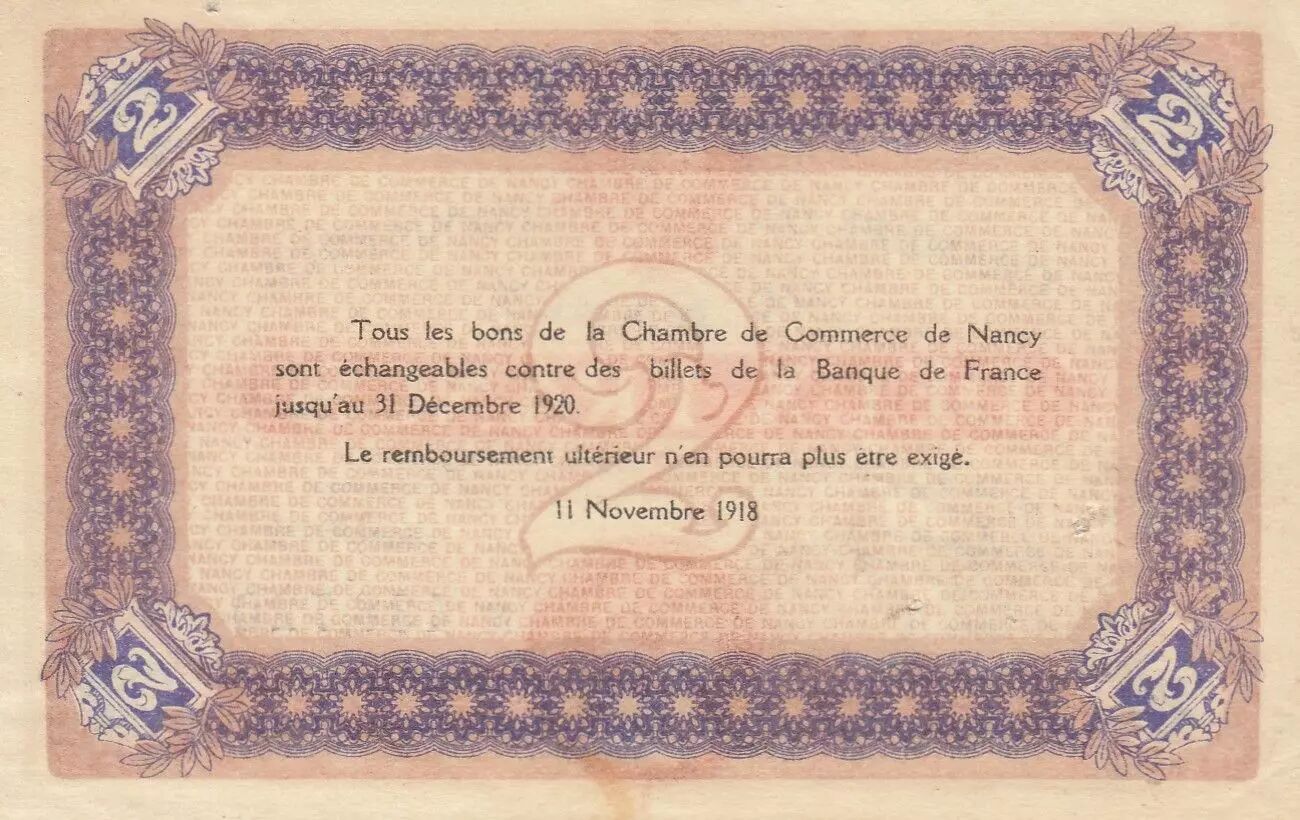 Home > French Banknotes > Necessity Money (1789-1945) > 1914-1925 Chamber of Commerce > France 2 Francs - Nancy - Chamber of Commerce - 11-11-1918 - Serial A