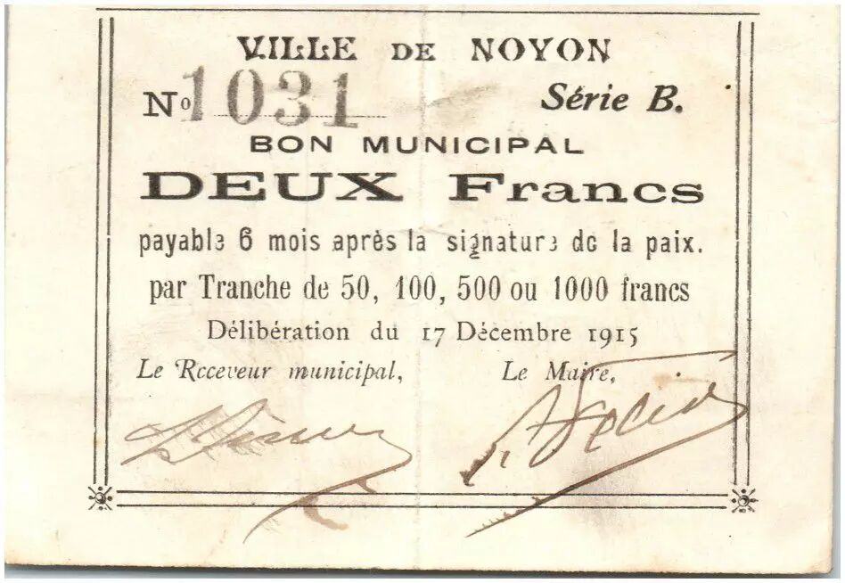 Banknote France 2 Francs Noyon City - 1915