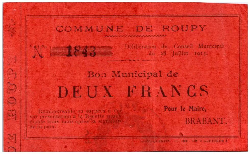 Billet France 2 Francs Roupy Commune - 1915