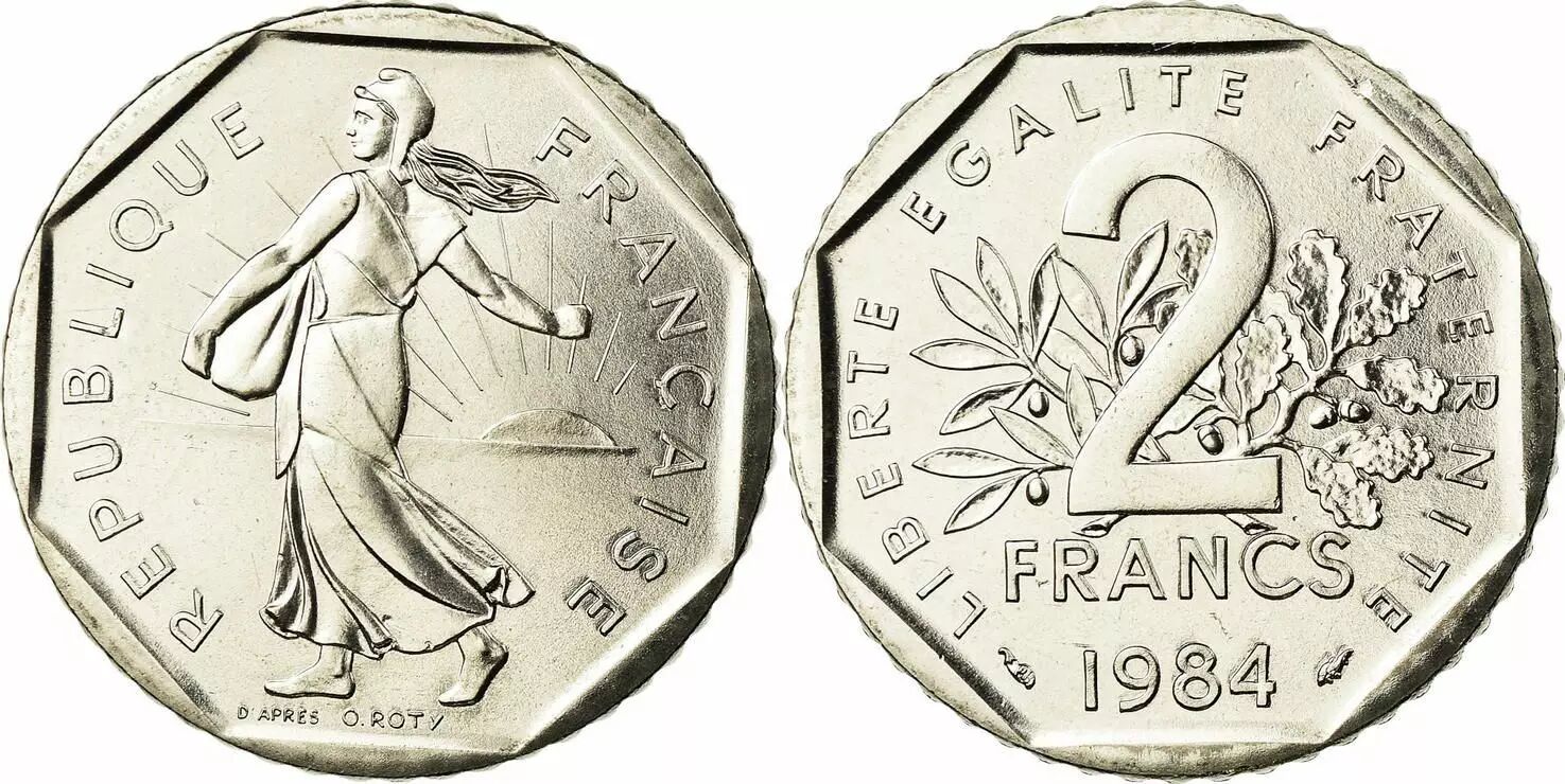 This 2 Franc coin, minted in 1984, is an example from a set. It is made of nickel and weighs 7.5 grams, with a diameter of 26.5 millimeters.