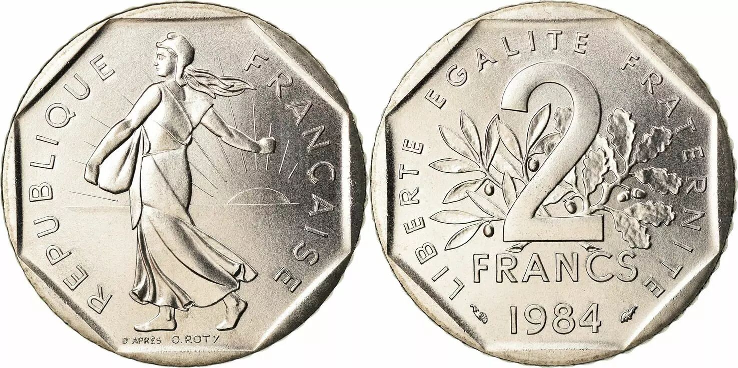 This 2 Francs coin, minted in 1984, comes from a "BU" (Brilliant Uncirculated) set, indicating a superior minting quality and optimal preservation condition. It is made of nickel, weighs 7.5 grams, and has a diameter of 26.5 millimeters.