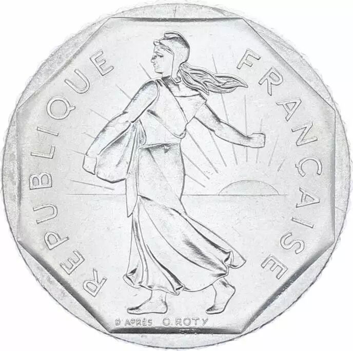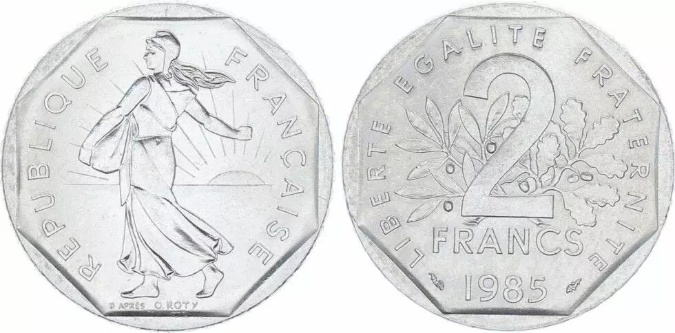 The 2 Francs Sower coin, minted in 1985, is a French coin with a face value of 2 francs. It is made of nickel, giving it a silver color. It weighs 7.5 grams and its diameter is 26.5 millimeters.