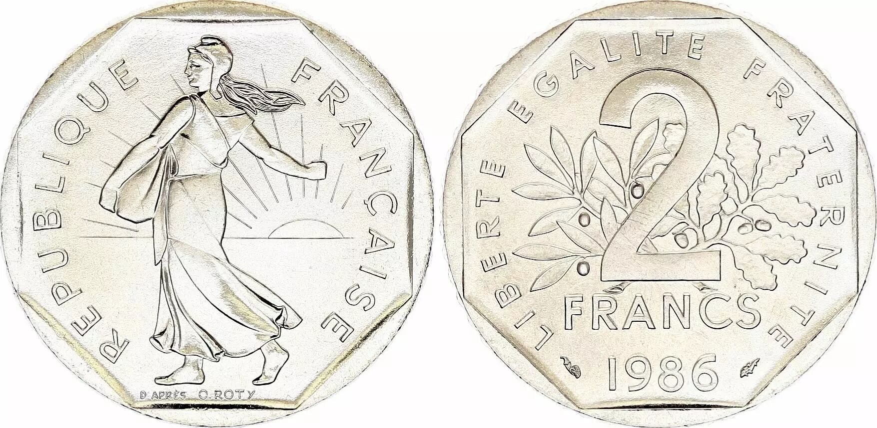 The 2 francs "Semeuse" coins were first struck in 1979 and continued to be produced until 2001. They were commonly used until the introduction of the euro in 2002. As with the 1 franc coin, "La Semeuse" on the 2 francs coin symbolizes the French Republic and its values.