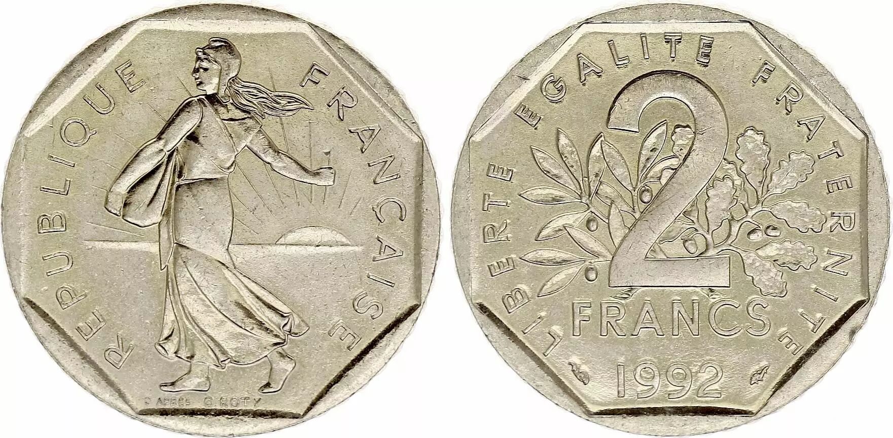 The 2 francs "Semeuse" coins were first struck in 1979 and continued to be produced until 2001. They were commonly used until the introduction of the euro in 2002. As with the 1 franc coin, "La Semeuse" on the 2 francs coin symbolizes the French Republic and its values.