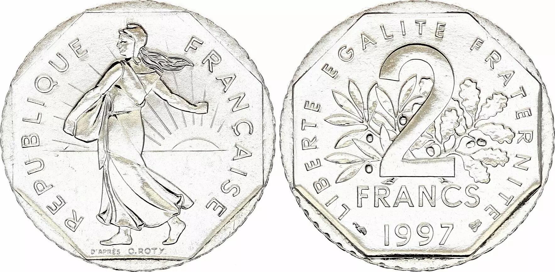 The 2 francs "Semeuse" coins were first struck in 1979 and continued to be produced until 2001. They were commonly used until the introduction of the euro in 2002. As with the 1 franc coin, "La Semeuse" on the 2 francs coin symbolizes the French Republic and its values.