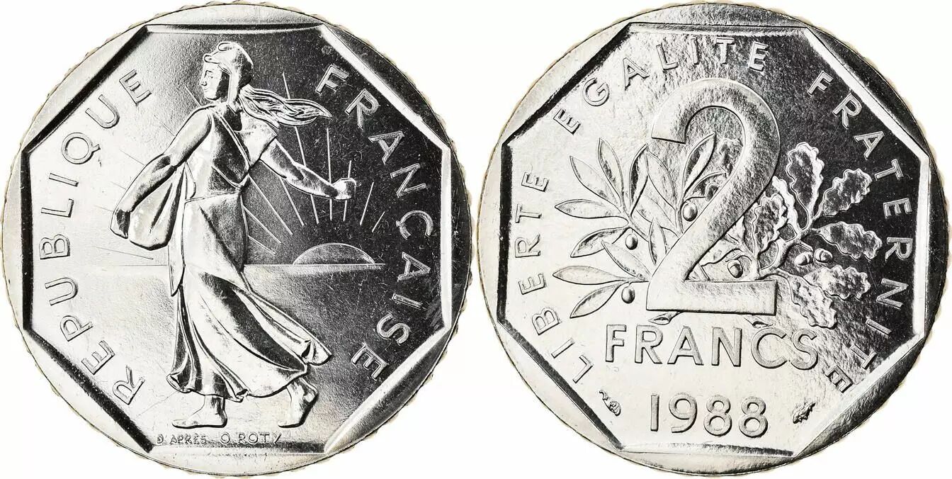 Cette pièce de 2 francs, frappée en 1988, est une représentation de la tradition numismatique française. Elle est composée de nickel, lui conférant une couleur argentée et une durabilité notable. Son poids est de 7,5 grammes, avec un diamètre de 26,5 millimètres et une épaisseur de 1,71 millimètre. La tranche de la pièce est cannelée, une caractéristique technique qui contribue à la fois à son esthétique et à sa fonctionnalité.