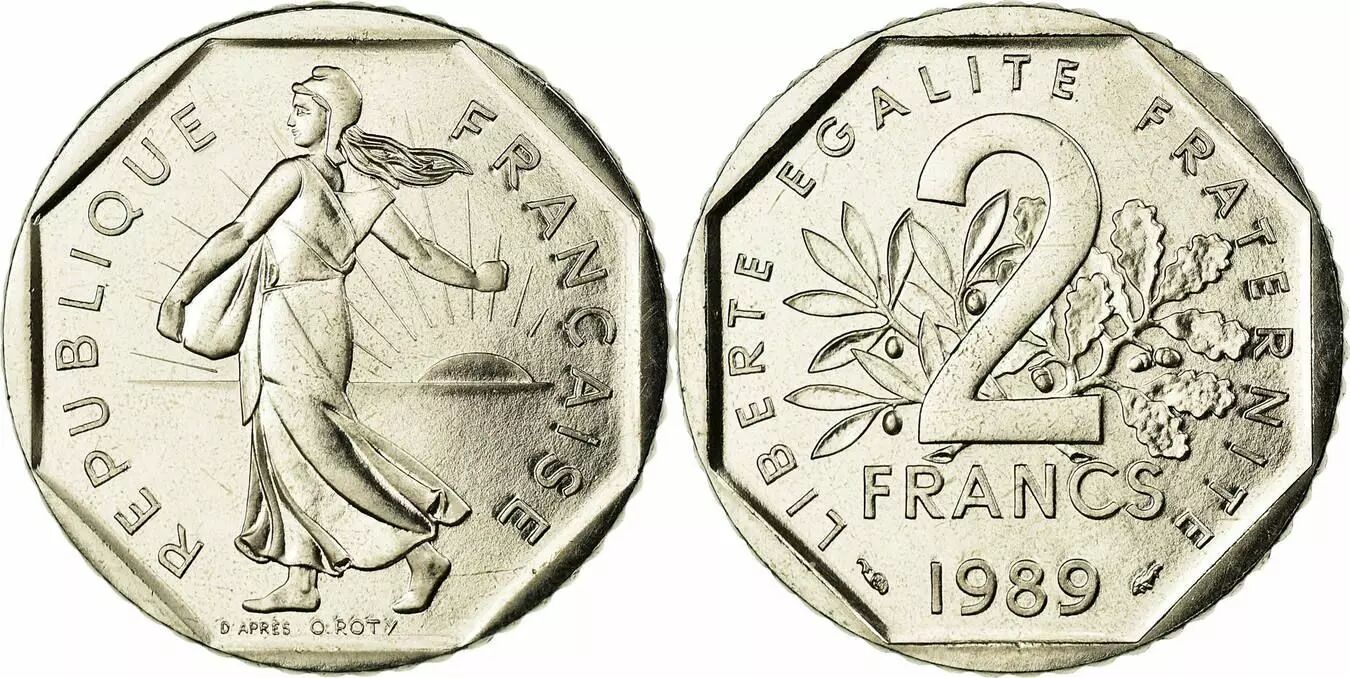 Cette pièce de 2 francs, frappée en France en 1989, est composée de nickel. Son poids est de 7,5 grammes et son diamètre mesure 26,5 millimètres. La tranche de la pièce est cannelée.