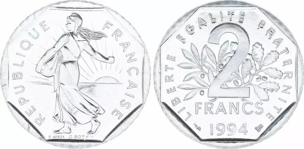 La pièce de 2 Francs Semeuse, datée de 1994, est une pièce de monnaie frappée avec une finition Brillant Universel (BU). Elle a été émise en France et possède une valeur nominale de deux francs.