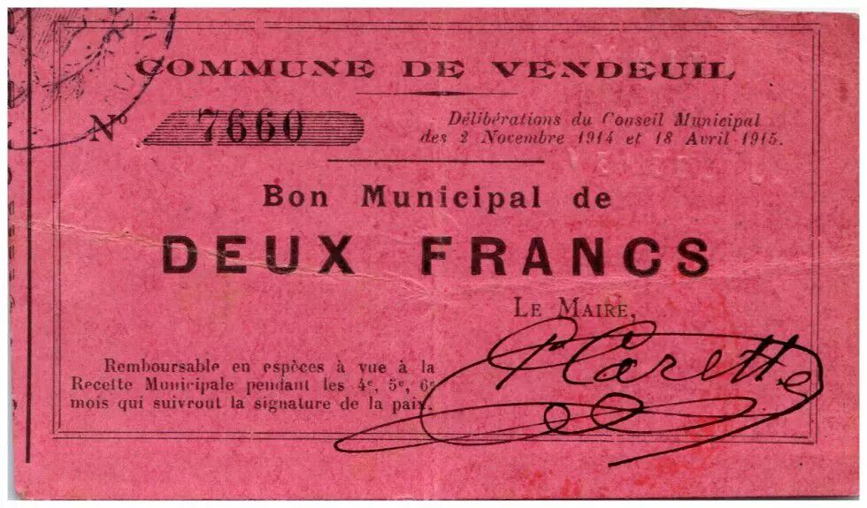 Banknote France 2 Francs Vendeuil City - 1914 - 1915