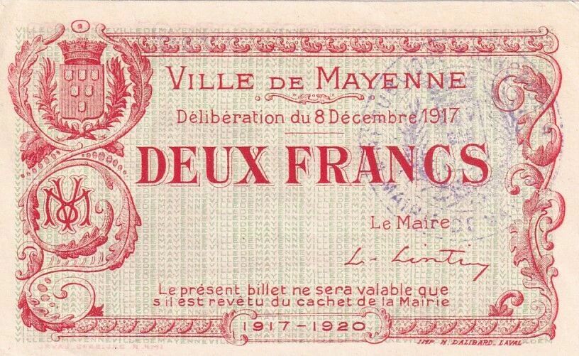 Billet France 2 Francs - Ville - Mayenne - 08-12-1917