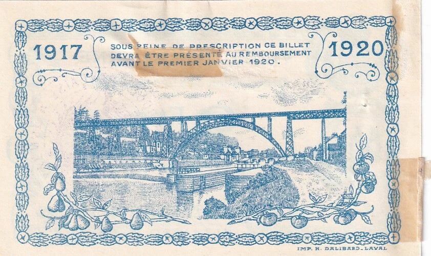 Ce billet de nécessité français a été émis par la commune de Mayenne, située dans le département du même nom (numéro 53), le 8 décembre 1917. Il s'inscrit dans la période des émissions de nécessité des Communes et Villes durant la Première Guerre mondiale, entre 1914 et 1918.
