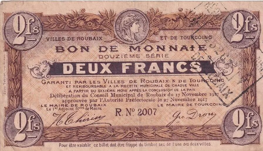 Ce billet est lié aux communes de Roubaix et Tourcoing, situées dans le département du Nord (59). Il s'agit d'une émission locale destinée à pallier les pénuries de monnaie durant la Première Guerre mondiale.