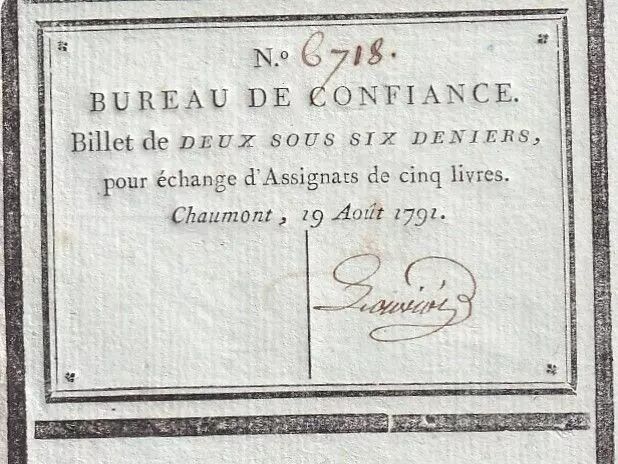 Billet France 2 Sous 6 Deniers - Haute-Marne - Bureau de Confiance de Chaumont - 19-08-1791 - 6718