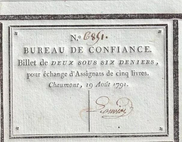 Home > French Banknotes > Necessity Money (1789-1945) > Confidence Notes 1789-1793 > France 2 Sous 6 Deniers - Haute-Marne - Bureau de Confiance de Chaumont - 19-08-1791 - 6851