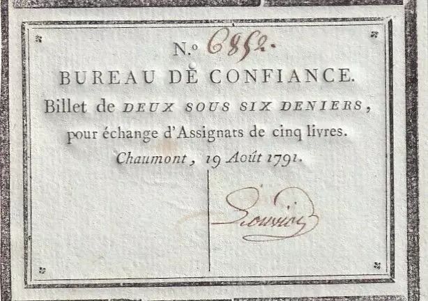 Home > French Banknotes > Necessity Money (1789-1945) > Confidence Notes 1789-1793 > France 2 Sous 6 Deniers - Haute-Marne - Bureau de Confiance de Chaumont - 19-08-1791 - 6852