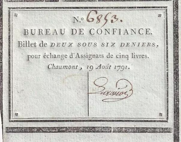 Home > French Banknotes > Necessity Money (1789-1945) > Confidence Notes 1789-1793 > France 2 Sous 6 Deniers - Haute-Marne - Bureau de Confiance de Chaumont - 19-08-1791 - 6853