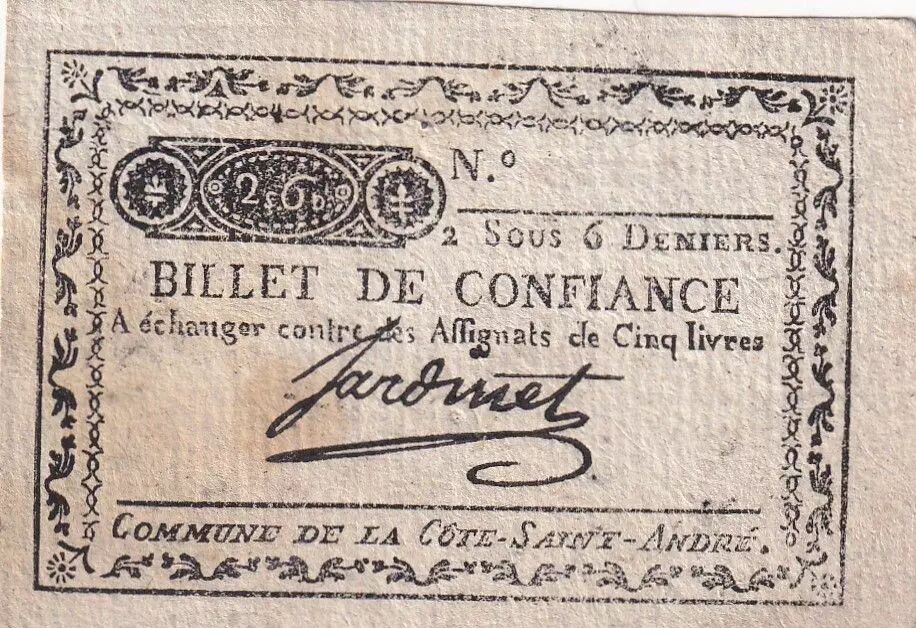 Home > French Banknotes > Necessity Money (1789-1945) > Confidence Notes 1789-1793 > France 2 Sous 6 Deniers - Isère - Commune de La Côte-Saint-André - 1792