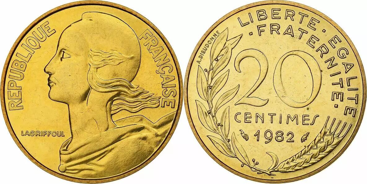 La pièce de 20 centimes Marianne, datée de 1982, est une pièce de monnaie française. Elle est frappée à partir d'un alliage de cuivre, d'aluminium et de nickel. Son poids est de 4 grammes et son diamètre mesure 23,5 millimètres. La tranche de la pièce est lisse.