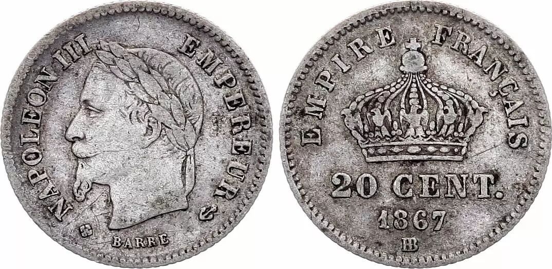 Coin France 20 Centimes Napoleon III - 1867 BB Strasbourg - Silver