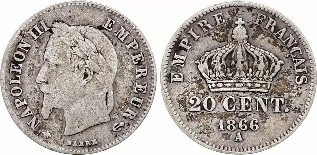 Accueil > Archivage > archivage-Monnaies françaises (470 à 2002) > France 20 Centimes Napoléon III Tête Laurée - 1866 A Argent