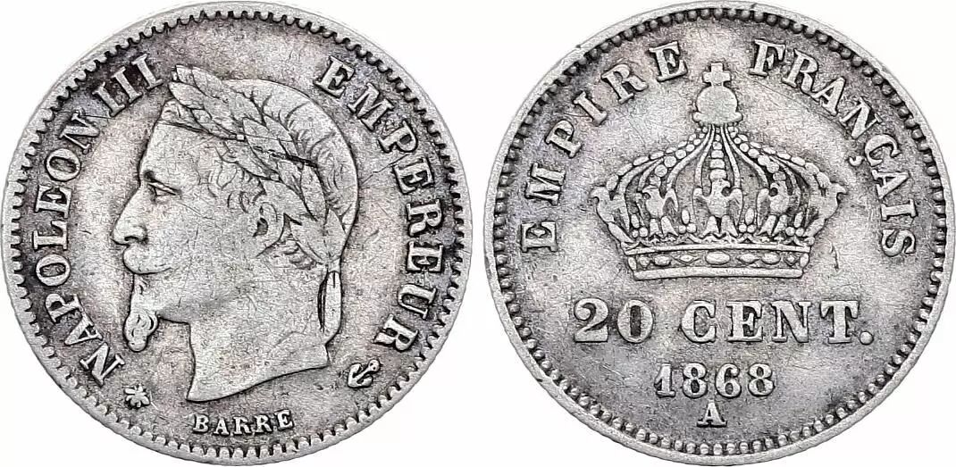 Accueil > Archivage > archivage-Monnaies françaises (470 à 2002) > France 20 Centimes Napoléon III Tête Laurée - 1868 A Argent