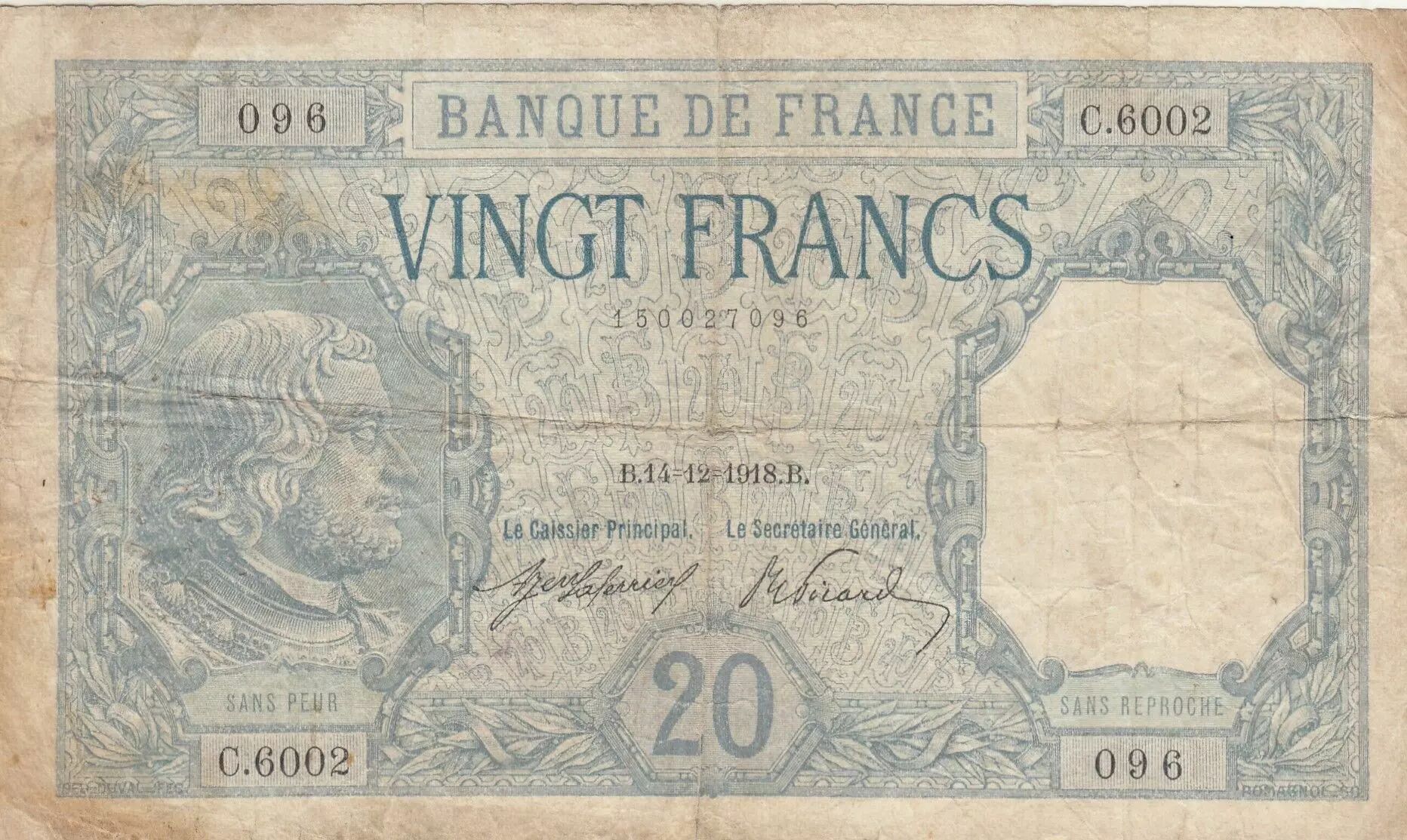 The 20 Francs Bayard banknote, dated December 14, 1918, is a testament to French monetary history. This banknote belongs to series C.6002.
