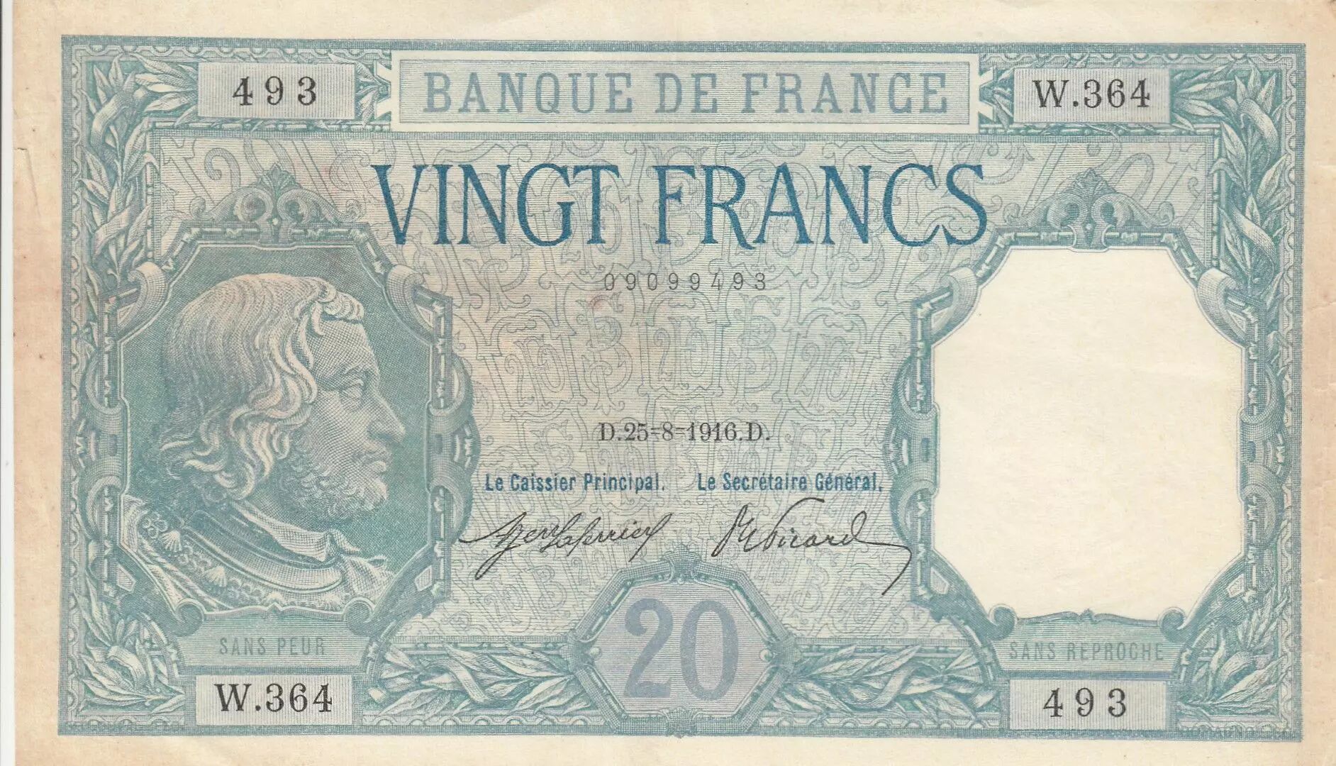 Accueil > Archivage > archivage-Billets Français > France 20 Francs - Bayard - 25-08-1916 - Série W.364