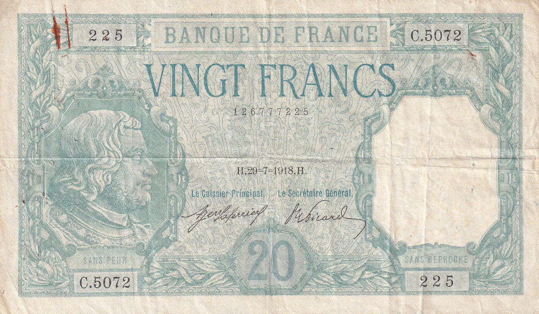 Home > > France 20 Francs - Bayard - 29-07-1918 - Serial C.5072 - F to VF - P.74