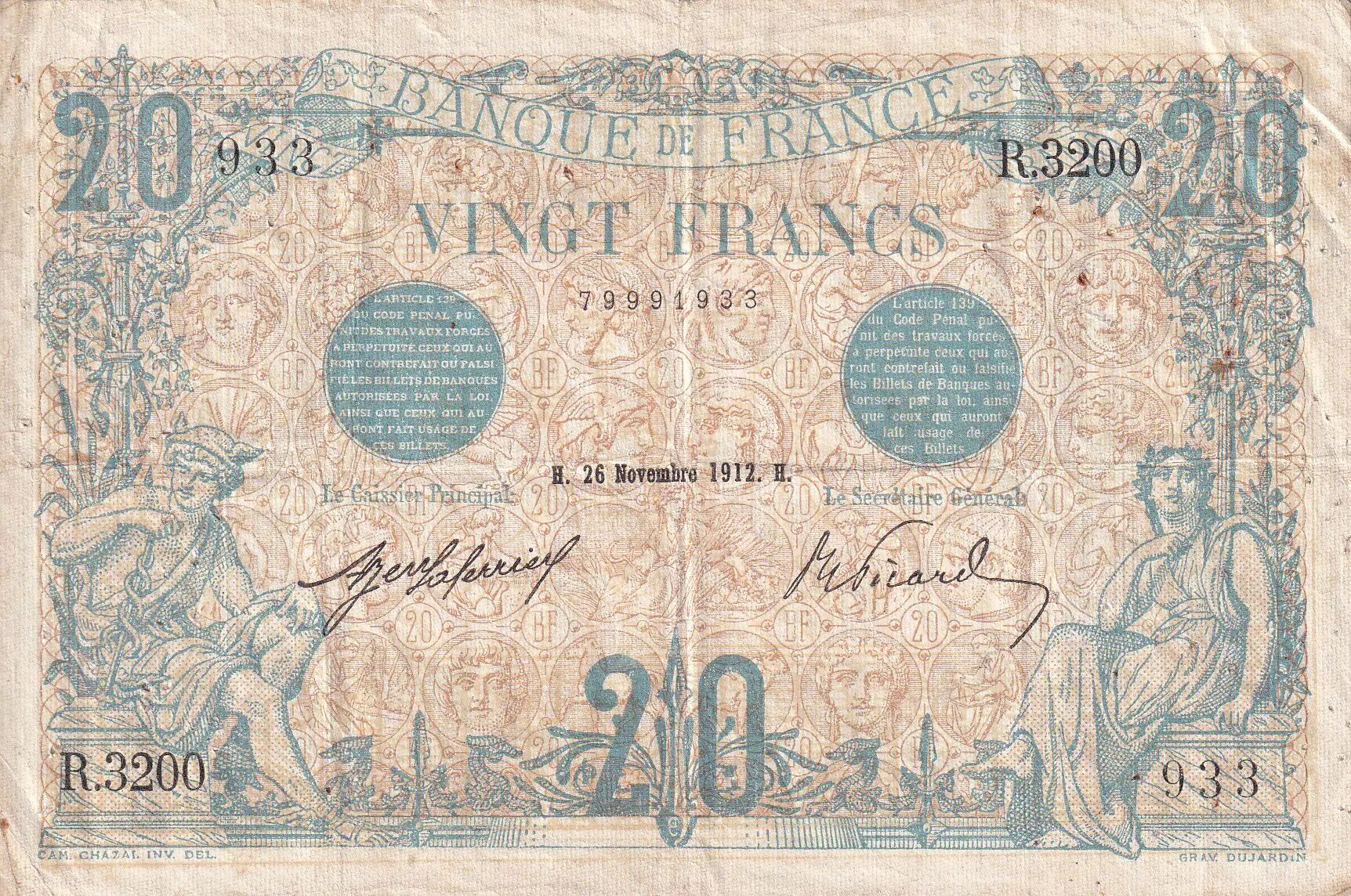 Accueil > Archivage > France 20 Francs - Bleu - 26-12-1912 - Série R.3200 - F.10.02