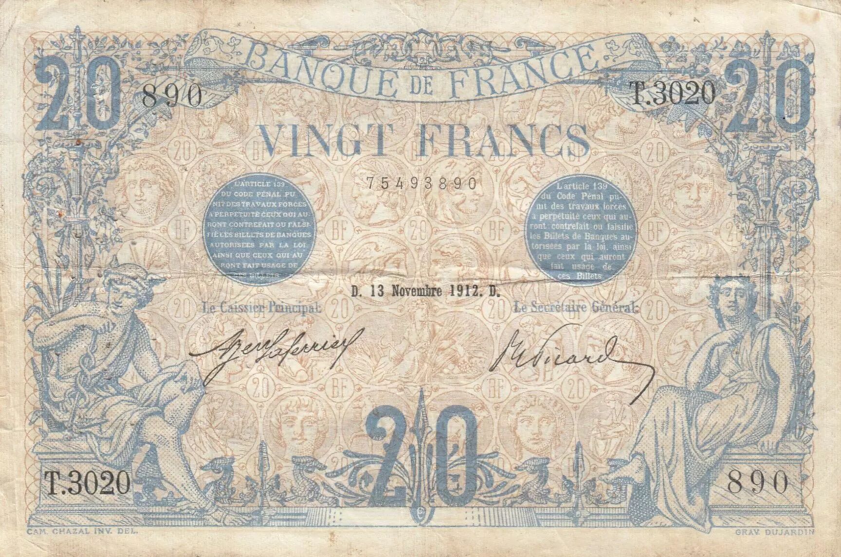Banknote France 20 Francs -Blue - 13-11-1912 - Serial T.3020
