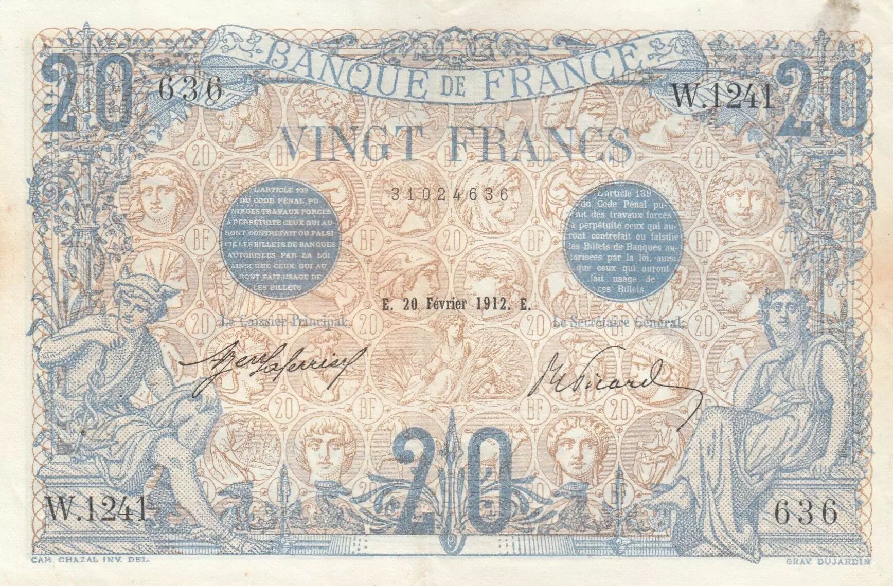 Home > > France 20 Francs - Blue - 20-02-1912 - Serial W.1241